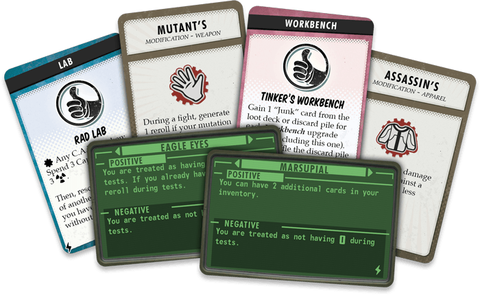 Vielleicht findet ihr ja ein C.A.M.P. mit einem eigenen Chemielabor, in dem ihr eure Abhängig-Eigenschaft loswerden könnt. Ihr könnt eure Waffe doppelläufig machen, damit ihr eine zweite Kampf-Aktion durchführen könnt. Oder wenn ihr genug Strahlung abbekommen habt werdet ihr ein Beuteldäuger, was euch weitere Kartenplätze für euer Inventar gibt, aber eure Intelligenz einschränkt. Egal, wohin eure Abenteuer euch führen, unerwartete Änderungen sind immer möglich – seien sie schärfere Augen oder eine zusätzliche Gliedmaße.